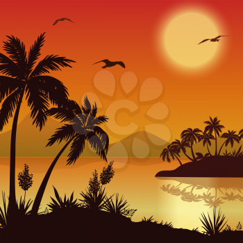 Tropical Landscape Sea Islands With Palm Trees Flowers Mountain Clouds Sun And Birds Gulls Black Silhouettes On Red Yellow Background Eps10 Contains Transparencies Vector 1201749 Iphotos Com